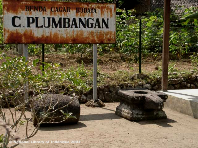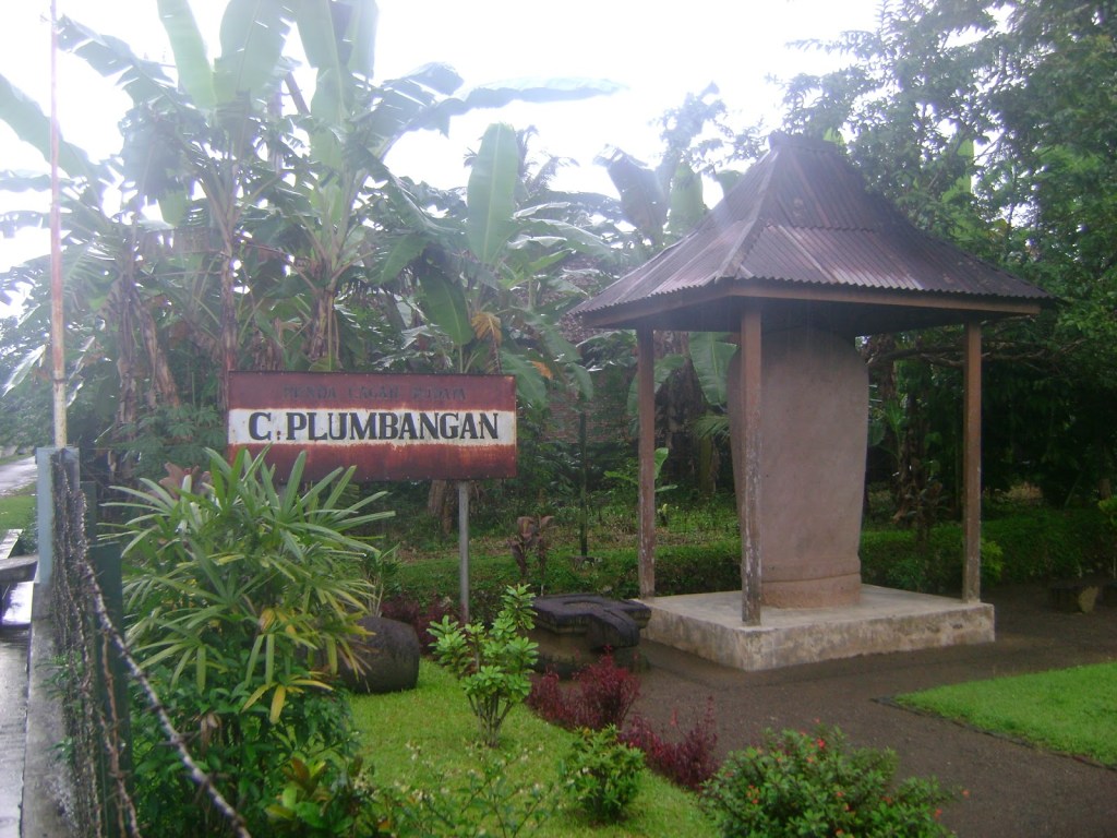 Sekitar 6 m dari gapura ke arah tenggara, terdapat sebuah prasasti yang disebut Prasasti Plumbangan atau Prasasti Panumbangan yang umurnya lebih tua dari Candi Plumbangan. Prasasti tersebut berangka tahun 1042 Saka (1120 M). Isinya sebuah keterangan bahwa Desa Panumbangan menjadi milik umat Buddha. Dari nama Panumbangan itulah nama Desa Plumbangan sekarang ini berasal.